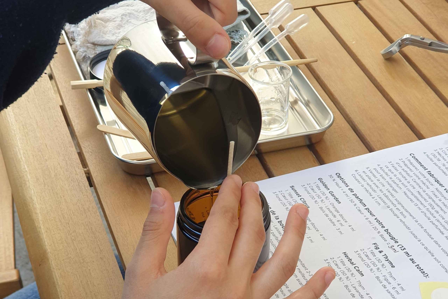 All tools and materials to create your own sustainable candle, including: Natural French rapeseed wax Organic cotton wick Fragrance oils from Grasse 24cl glass candle jar with lid Recycled paper label for your candle Up to three glasses of local wine from the South of FranceImportant Information