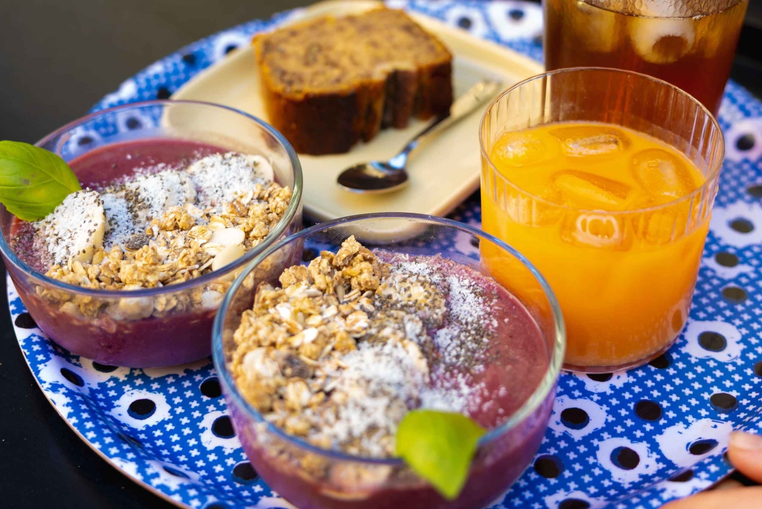 Brunch: fresh juice, smoothie, coffee, granola bowl, acai bowl, chia bowl, banana bread, energy balls